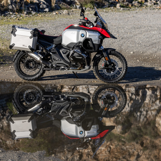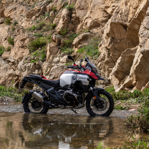 Met zijn Racing Red unilak heeft de nieuwe R 1300 GS Adventure in standaarduitvoering al een atletische en afgetrainde uitstraling, die uitnodigt tot het maken van nieuwe motoravonturen. De zilverkleurige tank, zwarte of rode buddyseats, zwarte handvatten, zwarte wielen en rode handkappen vormen een opvallend contrast.